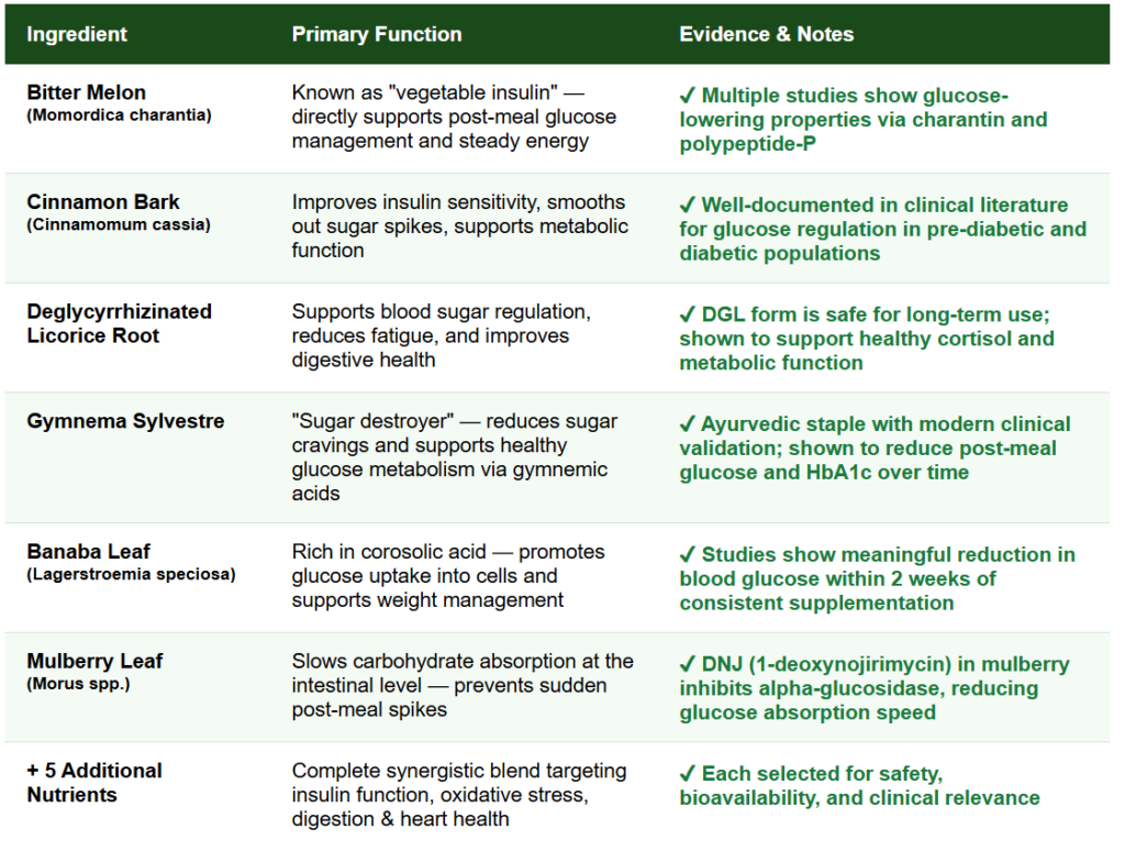 For people dealing with energy crashes, persistent sugar cravings, and unstable post-meal readings, the combination of Gymnema, Banaba, Bitter Melon, and Mulberry Leaf is genuinely science-backed.